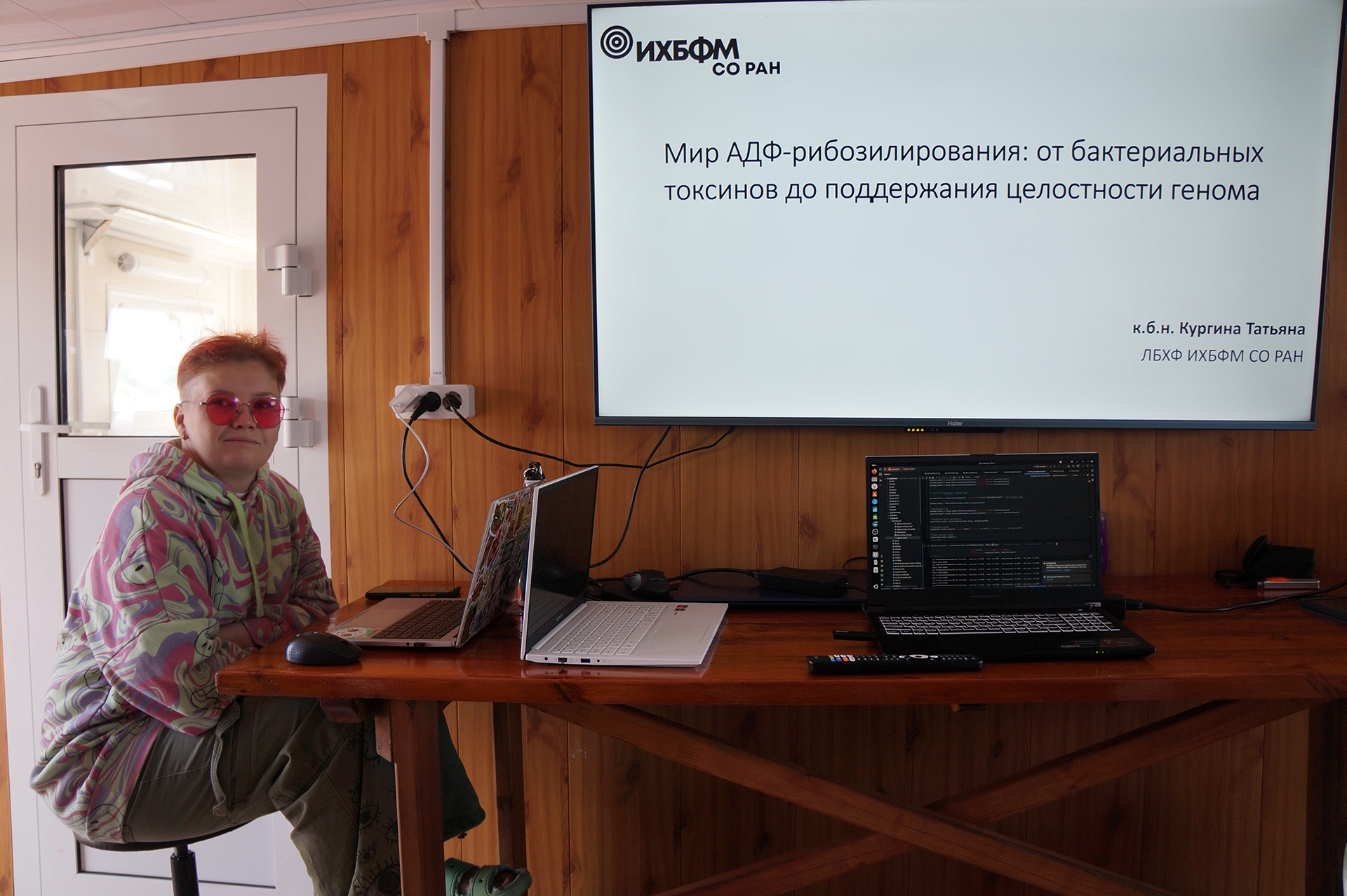 Утром Т.А. Кургина прочитала лекцию "Мир АДФ-рибозилирования: от бактериальных токсинов до поддержания целостности генома". Лекция охватывала механизм АДФ-рибозилирования, роль генов PARP1 и PARP2 в репарации ДНК и переход от бактериальных токсинов к эукариотическим системам защиты. Были обсуждены результаты экспериментов, демонстрирующих роль этого процесса в борьбе с повреждениями ДНК, и его потенциал для разработки методов терапии рака.