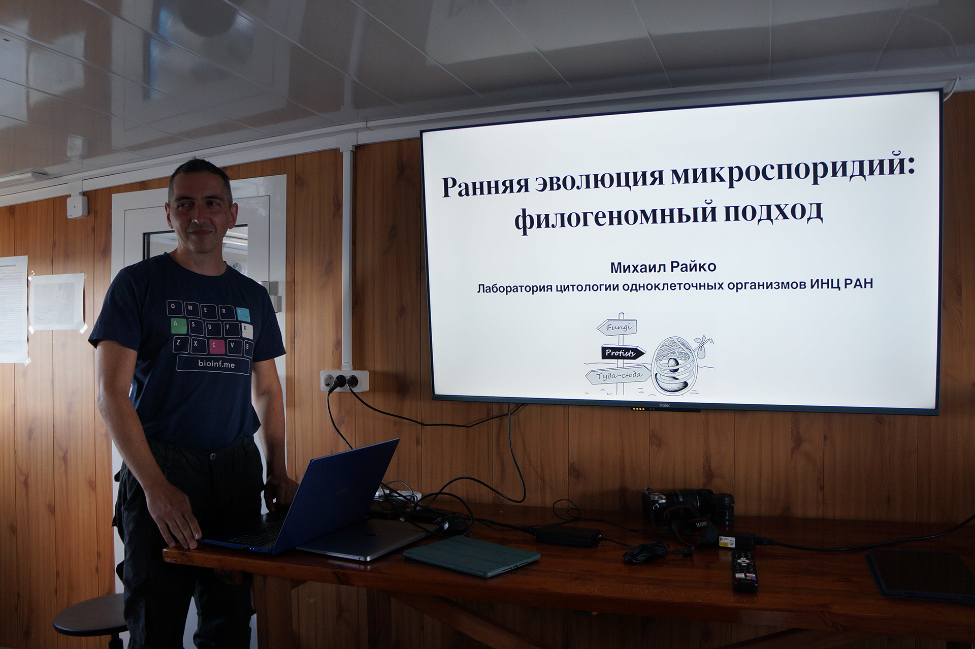 Вечером М.П. Райко представил лекцию "Ранняя эволюция микроспоридий: филогеномный подход". Лектор обсудил филогенетические методы для анализа микроспоридий, их происхождение как редуцированных грибов, геномные адаптации к паразитизму и упрощение метаболизма. Были приведены примеры из байкальских видов и обсуждены проблемы классификации этих паразитов.
