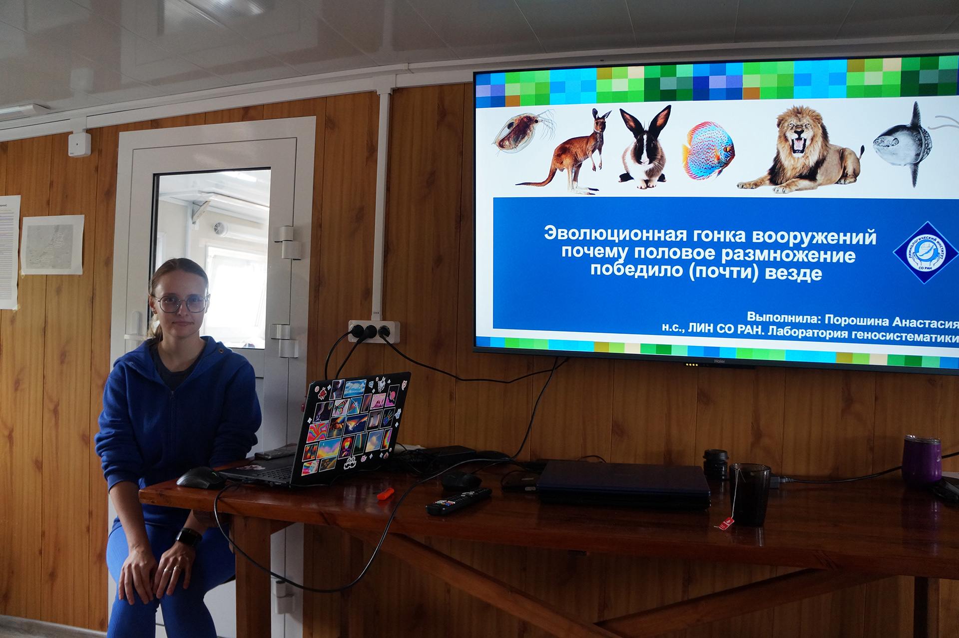 Утром А.А. Порошина выступила с лекцией на тему "Эволюционная гонка вооружений: причины доминирования полового размножения". В своём выступлении она рассмотрела различные стратегии размножения, объяснила, почему половое размножение имеет преимущества перед бесполым, а также обсудила механизмы поддержания эволюционной динамики и привела примеры из природы.
