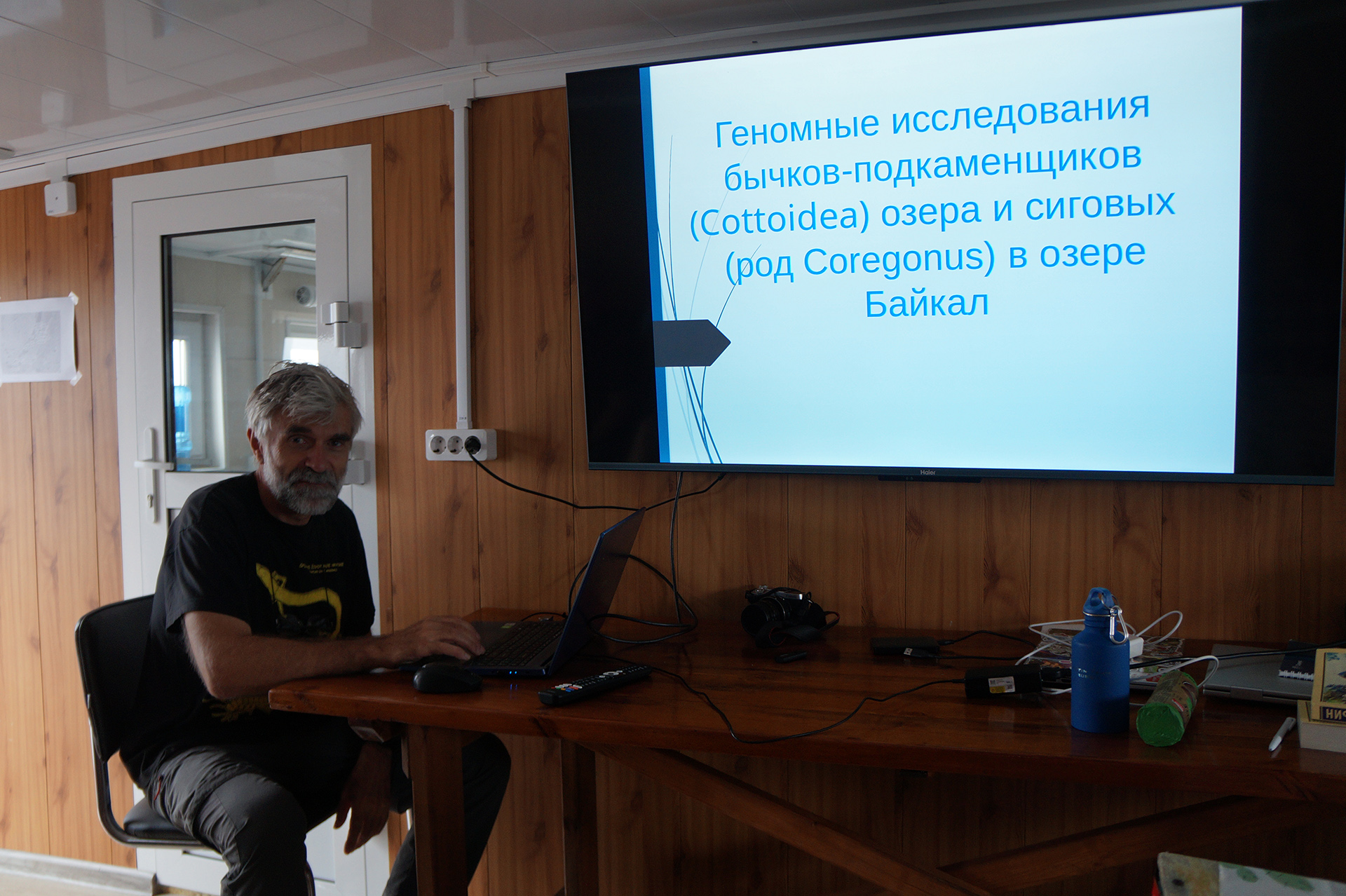 Утром Н.С. Мюге представил лекцию "Геномная эволюция байкальских бычков". Доклад был посвящен геномике байкальских бычков, их быстрому видообразованию, генетическим адаптациям к глубинам, сравнительному анализу геномов и роли интрогрессии в эволюции.