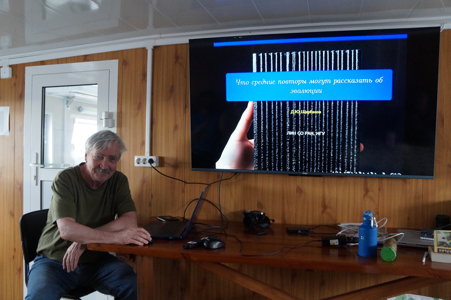 После Д.Ю. Щербакова прочитал лекцию "Что средние повторы могут сказать об эволюции". Лектор обсудил роль средних повторяющихся последовательностей в геномах, их использование для реконструкции филогений, примеры из байкальских организмов и эволюционные события вроде дупликаций.